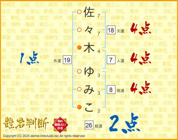 佐(7画)々(7画)木(4画) ゆ(3画)み(3画)こ(2画)