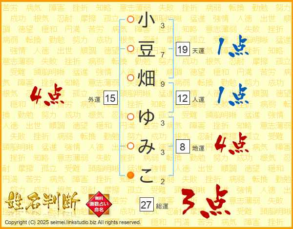 小(3画)豆(7画)畑(9画) ゆ(3画)み(3画)こ(2画)