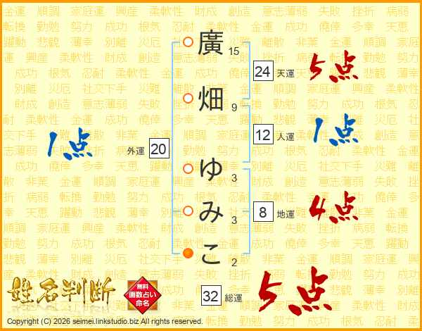 廣(15画)畑(9画) ゆ(3画)み(3画)こ(2画)
