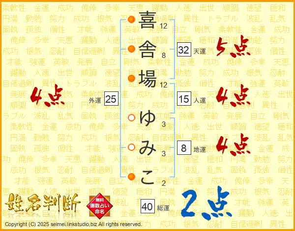 喜(12画)舎(8画)場(12画) ゆ(3画)み(3画)こ(2画)