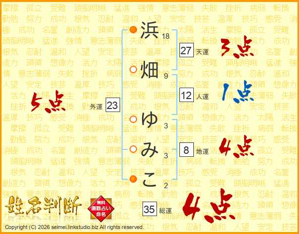 浜畑ゆみこさんの天運は27画の3点!