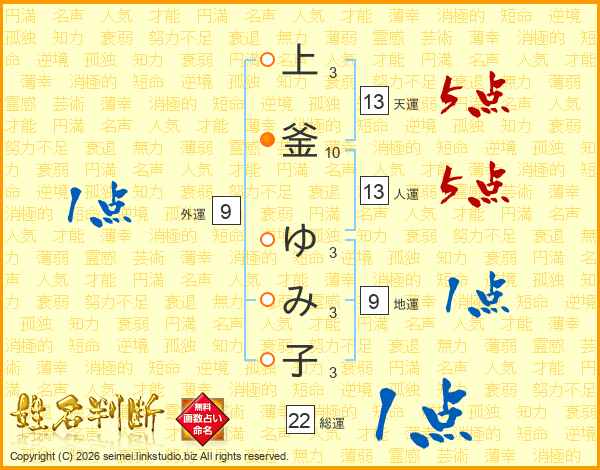 上(3画)釜(10画) ゆ(3画)み(3画)子(3画)
