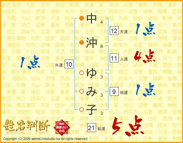 中沖ゆみ子さんの総運は21画の5点!