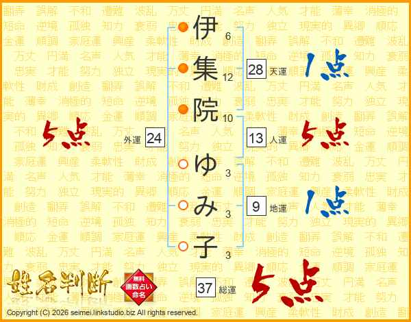 伊(6画)集(12画)院(10画) ゆ(3画)み(3画)子(3画)