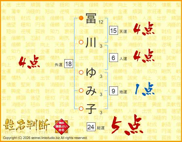 冨川ゆみ子さんの総運は24画の5点!