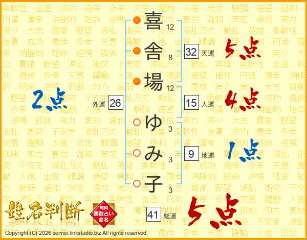 喜舎場ゆみ子さんの総運は41画の5点!