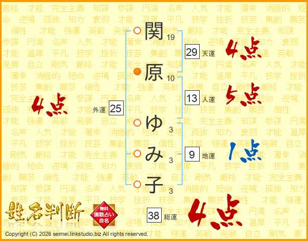 関(19画)原(10画) ゆ(3画)み(3画)子(3画)