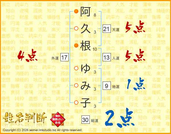 阿(8画)久(3画)根(10画) ゆ(3画)み(3画)子(3画)