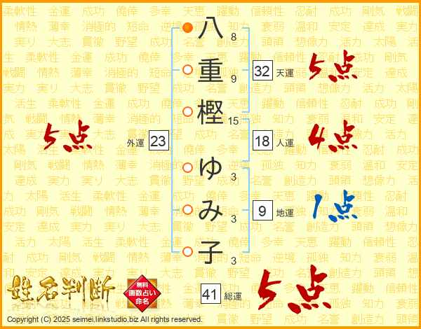 八(8画)重(9画)樫(15画) ゆ(3画)み(3画)子(3画)