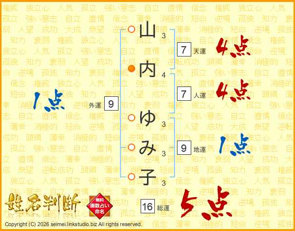 山(3画)内(4画) ゆ(3画)み(3画)子(3画)