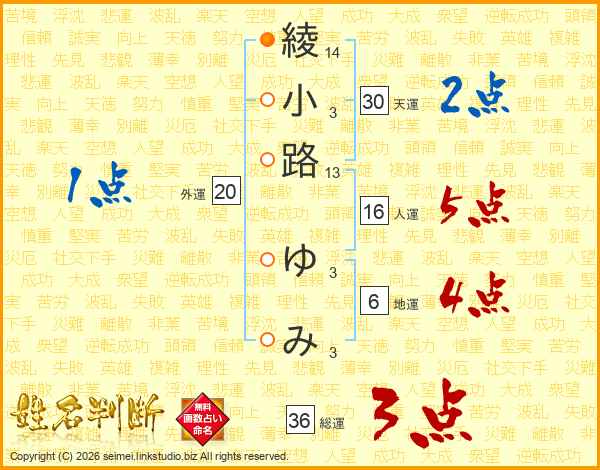 綾小路ゆみさんの総運は36画の3点!