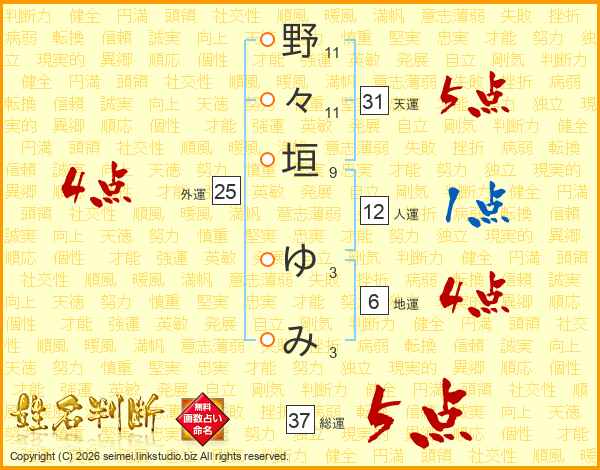 野々垣ゆみさんの総運は37画の5点!