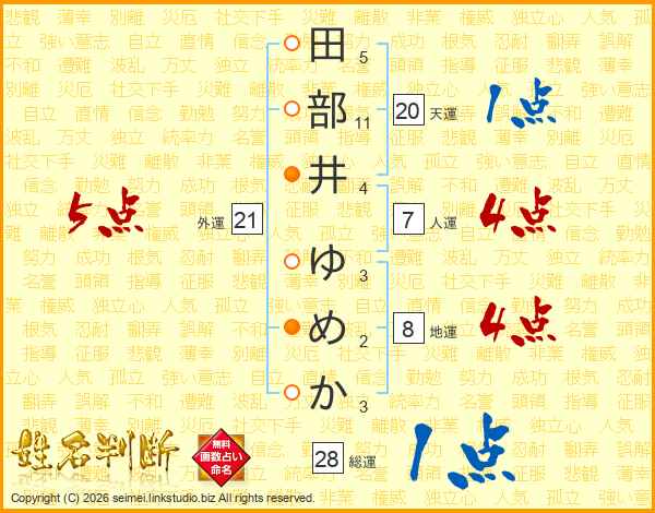 生活面を象徴する運勢です。外部から受ける影響力を表し、結婚運、家庭運や職場、環境への順応性を表します。総運から人運を引いた画数。姓や名が1文字の場合を除く。