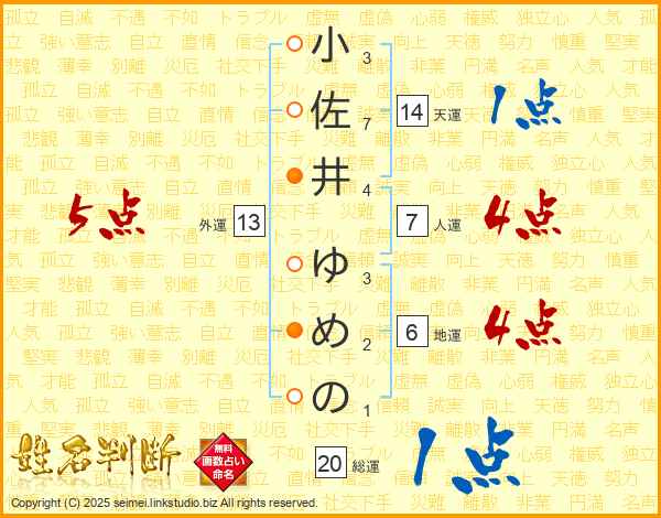 生活面を象徴する運勢です。外部から受ける影響力を表し、結婚運、家庭運や職場、環境への順応性を表します。総運から人運を引いた画数。姓や名が1文字の場合を除く。