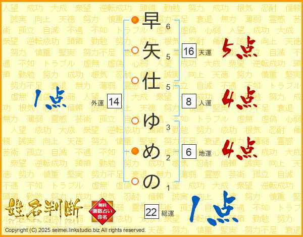 生活面を象徴する運勢です。外部から受ける影響力を表し、結婚運、家庭運や職場、環境への順応性を表します。総運から人運を引いた画数。姓や名が1文字の場合を除く。
