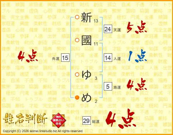 新國ゆめさんの総運は29画の4点!