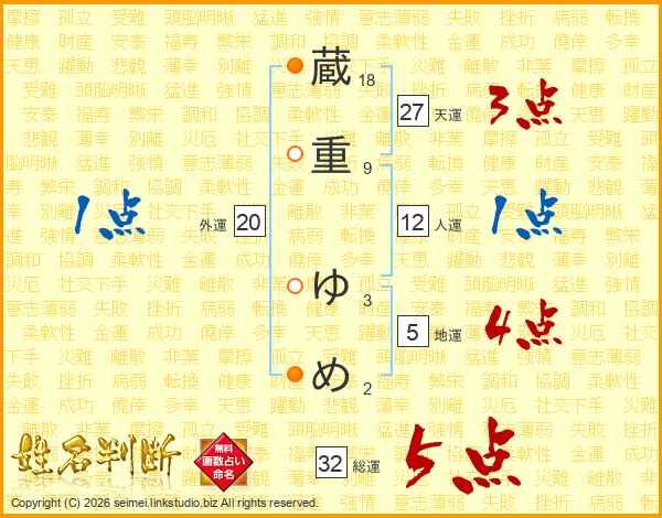 蔵(18画)重(9画) ゆ(3画)め(2画)
