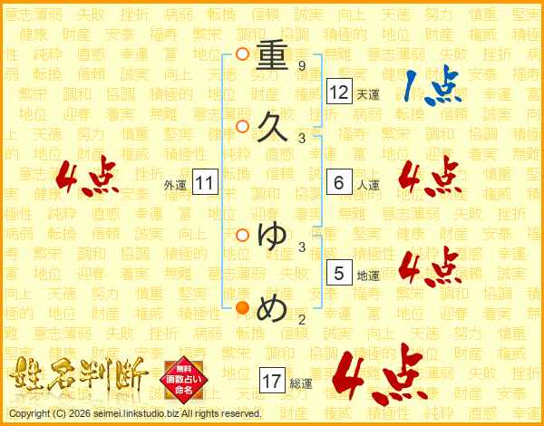 生活面を象徴する運勢です。外部から受ける影響力を表し、結婚運、家庭運や職場、環境への順応性を表します。総運から人運を引いた画数。姓や名が1文字の場合を除く。