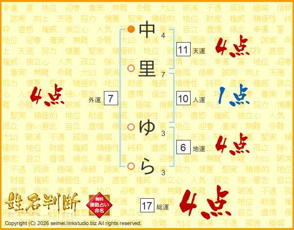 中(4画)里(7画) ゆ(3画)ら(3画)