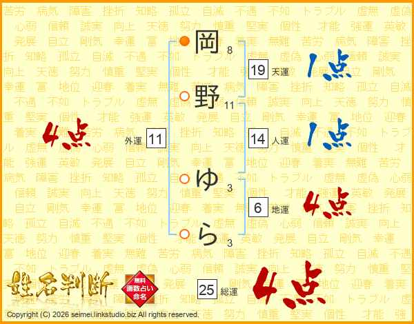 岡(8画)野(11画) ゆ(3画)ら(3画)