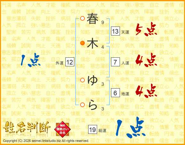 春木ゆらさんの総運は19画の1点!
