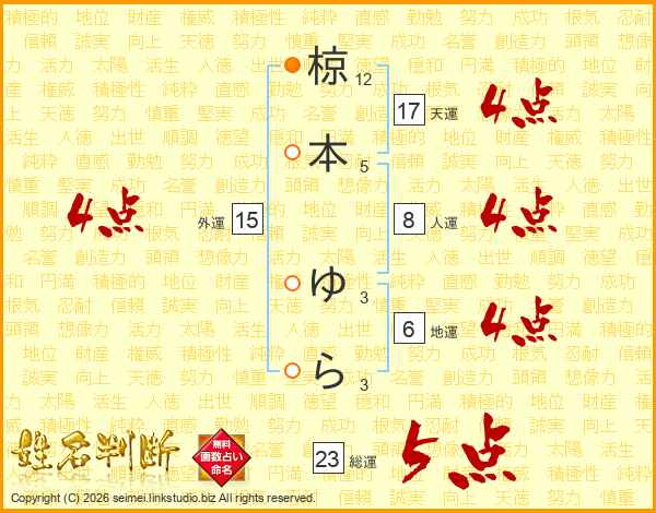 椋本ゆらさんの総運は23画の5点!
