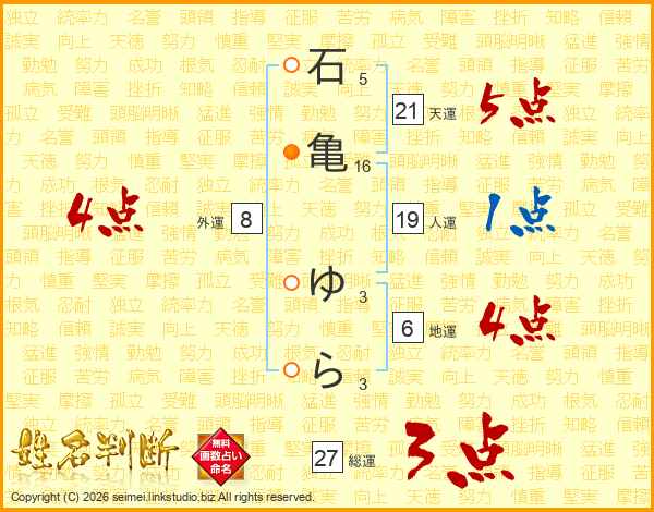 石亀ゆらさんの天運は21画の5点!