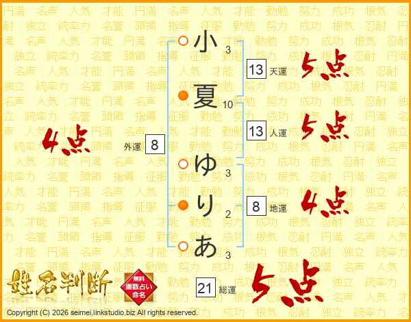 小(3画)夏(10画) ゆ(3画)り(2画)あ(3画)