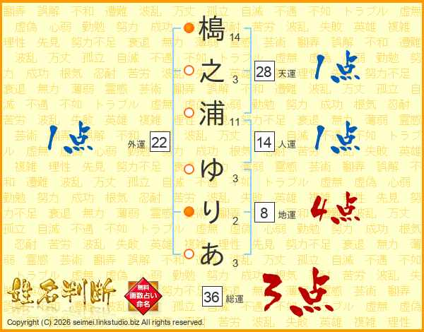 槝(14画)之(3画)浦(11画) ゆ(3画)り(2画)あ(3画)
