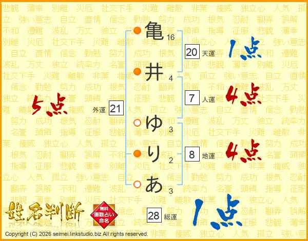 亀(16画)井(4画) ゆ(3画)り(2画)あ(3画)