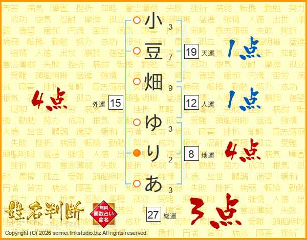 小(3画)豆(7画)畑(9画) ゆ(3画)り(2画)あ(3画)