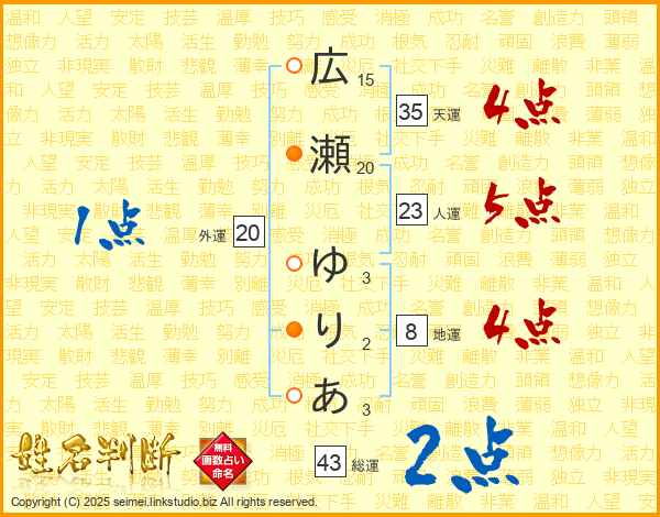 広(15画)瀬(20画) ゆ(3画)り(2画)あ(3画)