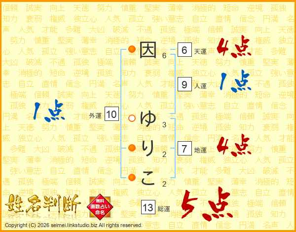 因(6画) ゆ(3画)り(2画)こ(2画)