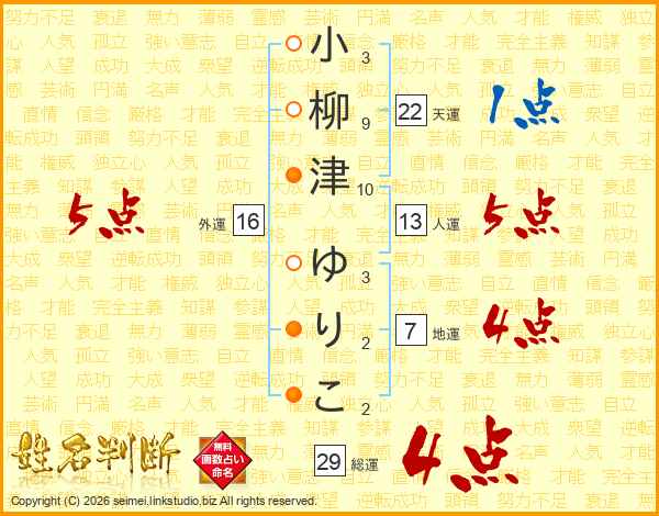 小(3画)柳(9画)津(10画) ゆ(3画)り(2画)こ(2画)