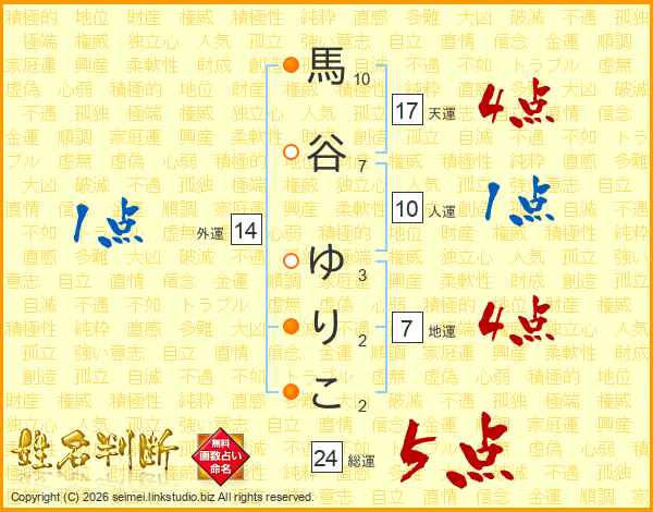 馬谷ゆりこさんの外運は14画の1点!