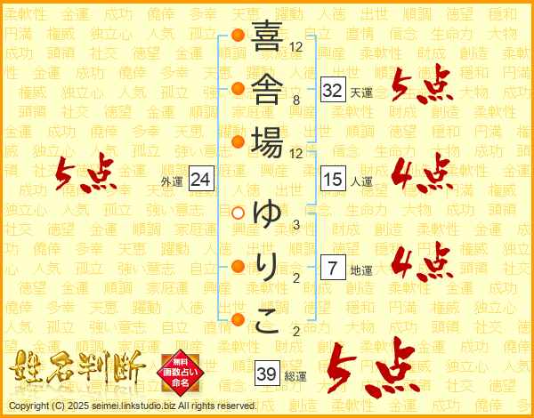 生活面を象徴する運勢です。外部から受ける影響力を表し、結婚運、家庭運や職場、環境への順応性を表します。総運から人運を引いた画数。姓や名が1文字の場合を除く。