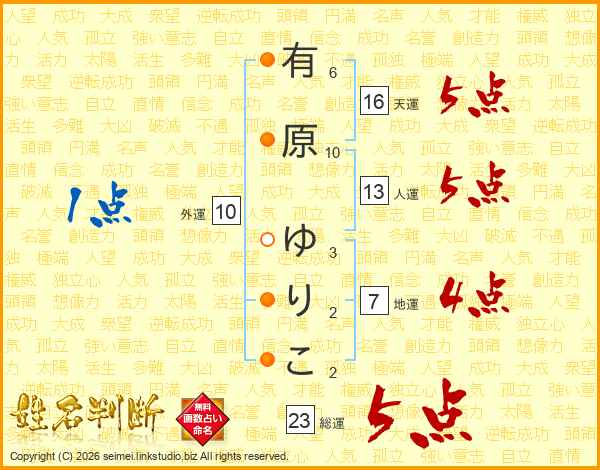 有原ゆりこさんの総運は23画の5点!