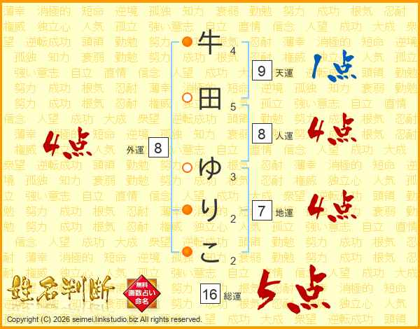 牛(4画)田(5画) ゆ(3画)り(2画)こ(2画)