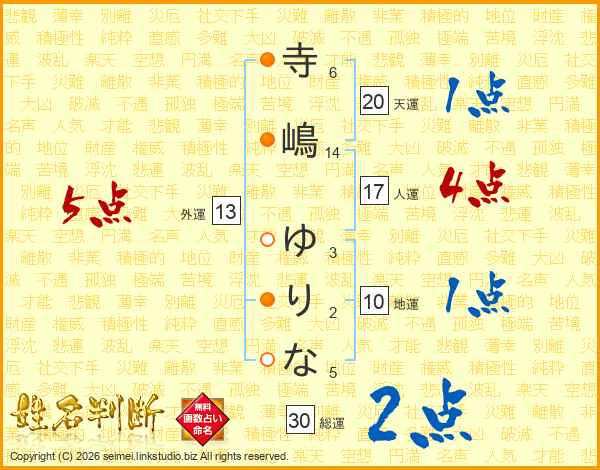 寺(6画)嶋(14画) ゆ(3画)り(2画)な(5画)