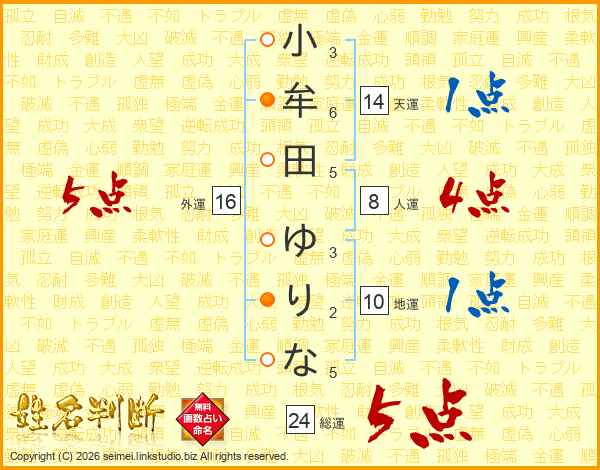 小牟田ゆりなさんの外運は16画の5点!