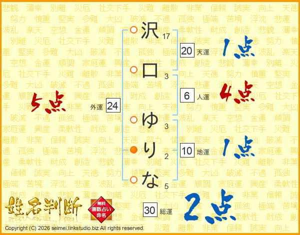 沢(17画)口(3画) ゆ(3画)り(2画)な(5画)