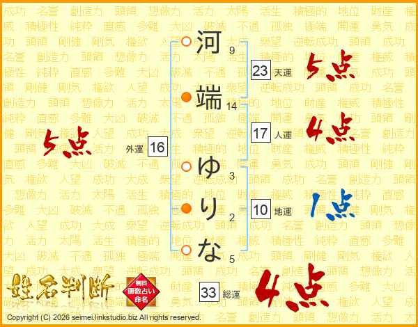 生活面を象徴する運勢です。外部から受ける影響力を表し、結婚運、家庭運や職場、環境への順応性を表します。総運から人運を引いた画数。姓や名が1文字の場合を除く。
