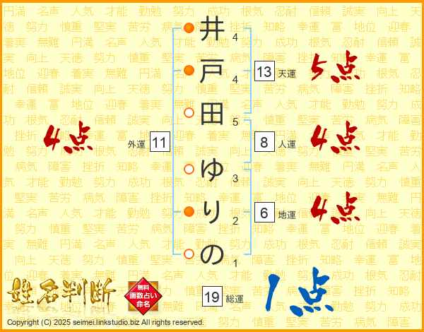 生活面を象徴する運勢です。外部から受ける影響力を表し、結婚運、家庭運や職場、環境への順応性を表します。総運から人運を引いた画数。姓や名が1文字の場合を除く。