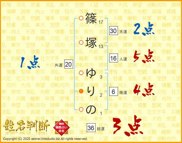 生活面を象徴する運勢です。外部から受ける影響力を表し、結婚運、家庭運や職場、環境への順応性を表します。総運から人運を引いた画数。姓や名が1文字の場合を除く。