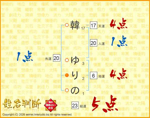 韓ゆりのさんの総運は23画の5点!