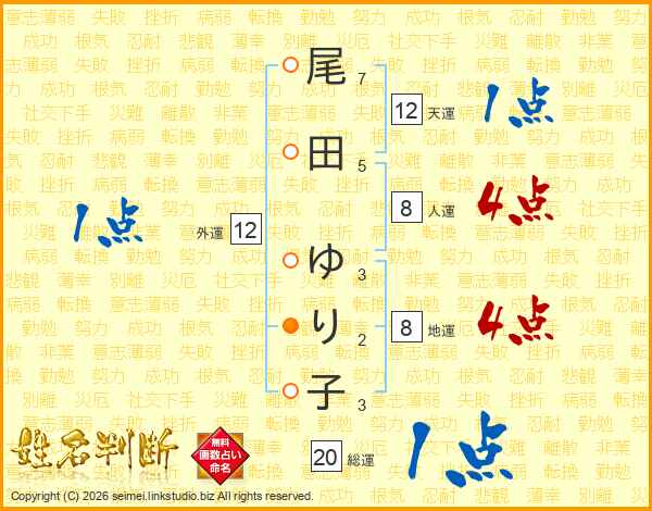 生活面を象徴する運勢です。外部から受ける影響力を表し、結婚運、家庭運や職場、環境への順応性を表します。総運から人運を引いた画数。姓や名が1文字の場合を除く。