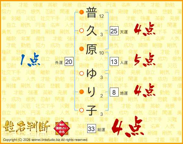普久原ゆり子さんの総運は33画の4点!