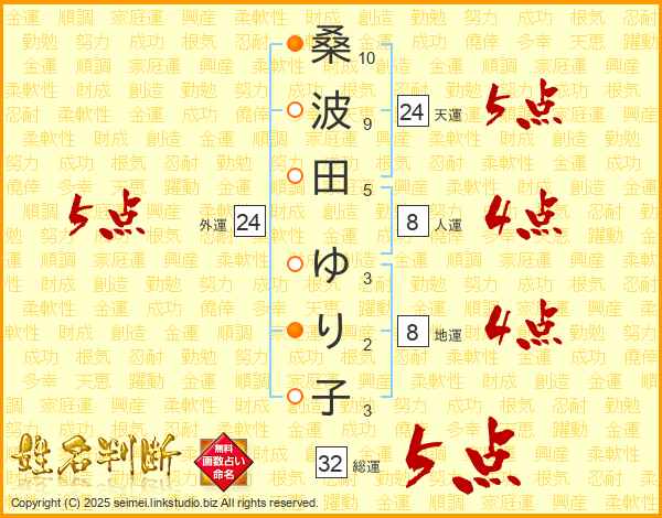 桑(10画)波(9画)田(5画) ゆ(3画)り(2画)子(3画)
