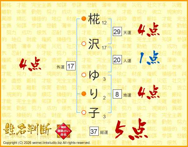 椛(12画)沢(17画) ゆ(3画)り(2画)子(3画)