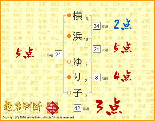 横(16画)浜(18画) ゆ(3画)り(2画)子(3画)